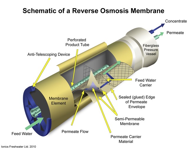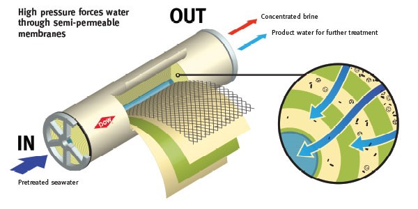 - The reverse osmosis process: can also be built with one or two passes, depending on the product water requirements and the seawater salinity and temperature. In most cases, 1 pass is sufficient to rich the EU drinking water standards, especially regarding the boron content (1 mg/L). WHO boron guideline (2 mg/L).
